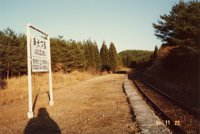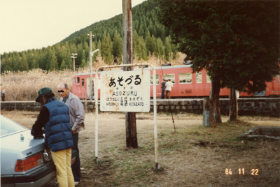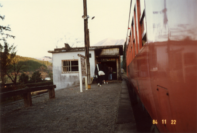 以前から乗っておきたいとは思っていたが、当時は北海道のローカル線のほうが気になっていて、宮原線廃止が10日後に迫った昭和59年11月末になって漸く乗車訪問の機会を得た。廃線間近ということもあって普段は閑散としているはずの列車は超満員で、残念ながら通路に立ったまま流れ行く車窓風景を眺めるのが精一杯の状態。民家も疎らな高原地帯を走っているのはなんとかわかったが、昭和49年まで駅員配置で今も遺構がよく保存されている町田駅の風情や温泉街にある当時唯一の中間有人駅であった宝泉寺駅の様子はほとんど視野に入らず、「これじゃあ、ただ乗ったというだけだな〜」と思っていたところ、なんと麻生釣駅では数分間停車するというアナウンス。鉄道マニアへの特別配慮だったのかどうか定かではないが、いずれにしても絶好のチャンス到来とばかりにホームに降り立ち、(たった?)2枚だけ写真に収めることができた。窓枠は残るものの大きな木立の中に廃墟のように建つ、奇妙な"石造り"の待合室はすぐに目に入ったが、まさかこれが昔の駅舎だとは露ほども思わず、内部をよく観察したりカメラに収めなかったことが今となっては残念でならない。情報通り周囲には民家がほとんどなく、深名線の蕗ノ台駅や白樺駅、白糠線の北進駅に似た"秘境感"が漂う本当に趣深い駅であった。