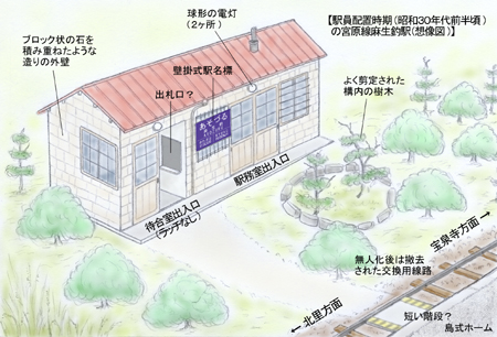 そこで、帰ってから早速ネット検索を掛けたところ、確かに麻生釣駅には昭和29〜36年の7年間だけ駅員が配置されていたことが判明。しかも、"熊本日日新聞"の「熊日写真ライブラリー」には昭和33年11月頃に件の駅舎を撮った写真が掲載されており、直立して列車を見送る駅員らしき人物も確認できた。ネット上では、この他にも無人化直後(昭和36年11月頃)のやはり駅舎を撮った画像が某HPに掲載されており、この2枚と廃線頃の待合所画像を参考にして、左のような在りし日の想像図を描いてみた。