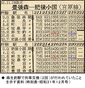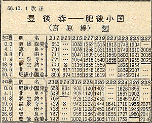 交通公社の時刻表(昭和36年10月号)。無人化直後のダイヤ改正により麻生釣駅での列車交換が廃止されたことがわかる。しかし、運転本数は逆に増えており、とりわけ肥後小国―北里間の"1駅列車"は目を惹く。(「北里行(FOR KITAZATO)」というサボが今もどこかに残っているのだろうか?)