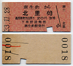 麻生釣駅発行の北里ゆき普通片道乗車券(昭和33年発行)摸擬券。入場券よりは実際に発行された可能性は高い。もし実在してオークションに出れば2万円以上?