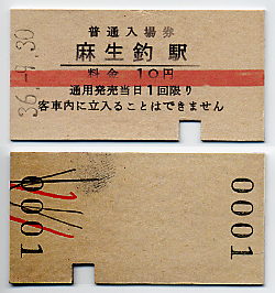 多くの資料では、麻生釣駅は昭和29年3月15日の開業時から"無人駅"ということになっていて、実際オークションなどで乗車券類を見掛けたことは皆無だが、前述の通り、当駅は昭和36年9月30日まで駅員がいたことがわかっているので、当然のことながら「出札業務は行われなかったのか」という疑問が湧く。この件については、「"sunebuとchabin"様のHP」に詳しい"鑑定"が掲載されているが、筆者としても改めて検討を加えてみたい。