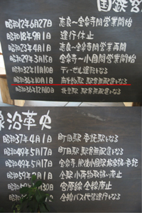 ・・・その後、ずっと宮原線や麻生釣駅のことは忘れていたが、つい先日、家族と旧・肥後小国駅跡に建つ「道の駅・小国(ゆうステーション)」に立ち寄る機会があり、何気なく2階のギャラリーをのぞいていたら、右の掲示プレート("国鉄宮原線沿革史")を見つけた。当・道の駅には旧・肥後小国駅構内にあった線路やポイント・駅名標の一部などもそのまま保存されており、このプレートも宮原線の廃線を記念して作製されたもの思われるが、なんと箇条書きの中に「昭和36年10月1日 麻生釣駅 駅員無配置となる」の1行を発見してびっくり仰天。筆者が常日頃頼りにしている「鉄道入場券図鑑 / 国鉄入場券チェックリスト」を初めとするほとんどの文献では、麻生釣駅は昭和29年の"開業時から無人駅"となっていたので、「あの秘境駅にかつて駅員がいた」という事実に強い衝撃を受けたのだった。