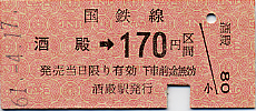 問題となっているような古い時代のことはよくわからないが、近年(民営化前頃)の便宜出札としては、香椎線酒殿駅(左)や日田彦山線石田駅、田川線崎山駅、佐賀線諸富駅、大村線南風崎・松原駅、松浦線上相浦駅など(いずれも無人化直後の暫定営業を除く)の"無人駅"で少なくとも一時期、左のような硬券の片乗(B型赤地紋金額式)を発売した例が知られている。これらの券には、民間会社等の簡易委託券に付される(ム)の記号がなく、様式的に一般駅・旅客駅発行の券と区別できないのが特徴で、入鋏規則は定かではないが改札鋏もちゃんと常備されていた。