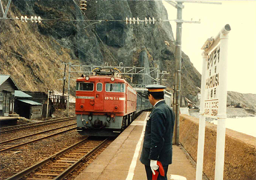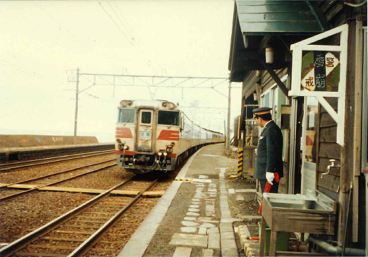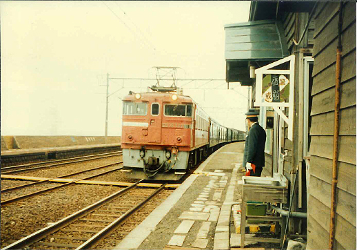 「駅舎側ホームを通過中の旧客は、たぶん札幌〜函館の42レ銭函発14:10 張碓通過、朝里発14:20。82系函館行き『北海』は 札幌発13:50 小樽14:21着 この間に通過。威風堂々、あこがれの特別急行です。涙モノです。海側の旧客は、おそらく函館〜札幌の121レ。これは張碓停車で発車が14:51。駅長に『通過列車が多いのでなかなか帰れなくなるよ』とか言われて、これに乗ったのかも知れません。