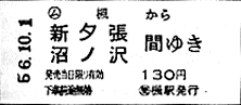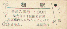 (簡)楓駅発行の新夕張/沼ノ沢間ゆき普通片道乗車券(昭和56年発行・コピー)。簡易委託券なので小児断線はなく、"ム"(無人駅)の記号が付けられている。どこで売られたものか、現在も売られているのかなど詳細は不明。ただ、新駅については「開業直後の極一時期のみ、駅舎内に出札用のブースを設けて乗車券の発売を行った」という話を聞いたことがあり、この真偽も現在調査中。ご存じの方は是非ご一報ください。
