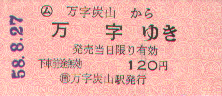 (簡)万字炭山駅発行の万字ゆき普通片道乗車券(昭和58年発行)。簡易委託券なので小児断線はなく、"ム"(無人駅)の記号が付けられている。廃止直前まで発売されていたので、それ程珍しいものではない。