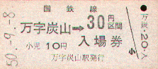 普通入場券 30円乗入併用券(昭和50年発行)。”キップマニアの不思議な世界”「プレミアの付く条件」で紹介したように、昭和48年から最低運賃区間の片乗を入場券に代用できることになったため、万字線では万字・万字炭山駅で30円券の後半から左のような乗車券・入場券併用券が発売されるようになった。30円併用券には複数様式あり、左は比較的初期のもの。また、"白券"(専用券)も存在するが、残存枚数が少ないため相場はかなり高めだ(昭和44〜48年頃に発売されたもの)。併用券に関しては、日高三股駅長氏のHP(「秘境日高三股へようこそ!」)に詳しい研究・解説があるので、是非参照されたい。