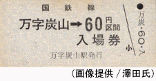 普通入場券 60円乗入併用券(無日付・最終額面券)。昭和52年前後に乗車券類の地紋色の変更があったため、60円併用券にも青地紋(前期)のものと赤地紋(後期)のものが存在する。(どちらかと言えば青地紋(前期)の方が稀少?) 万字炭山駅の赤地紋併用券が存在するかどうかは微妙だ。もしお持ちの方がおられましたら、是非ご一報下さい。