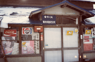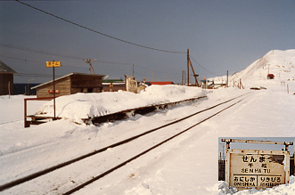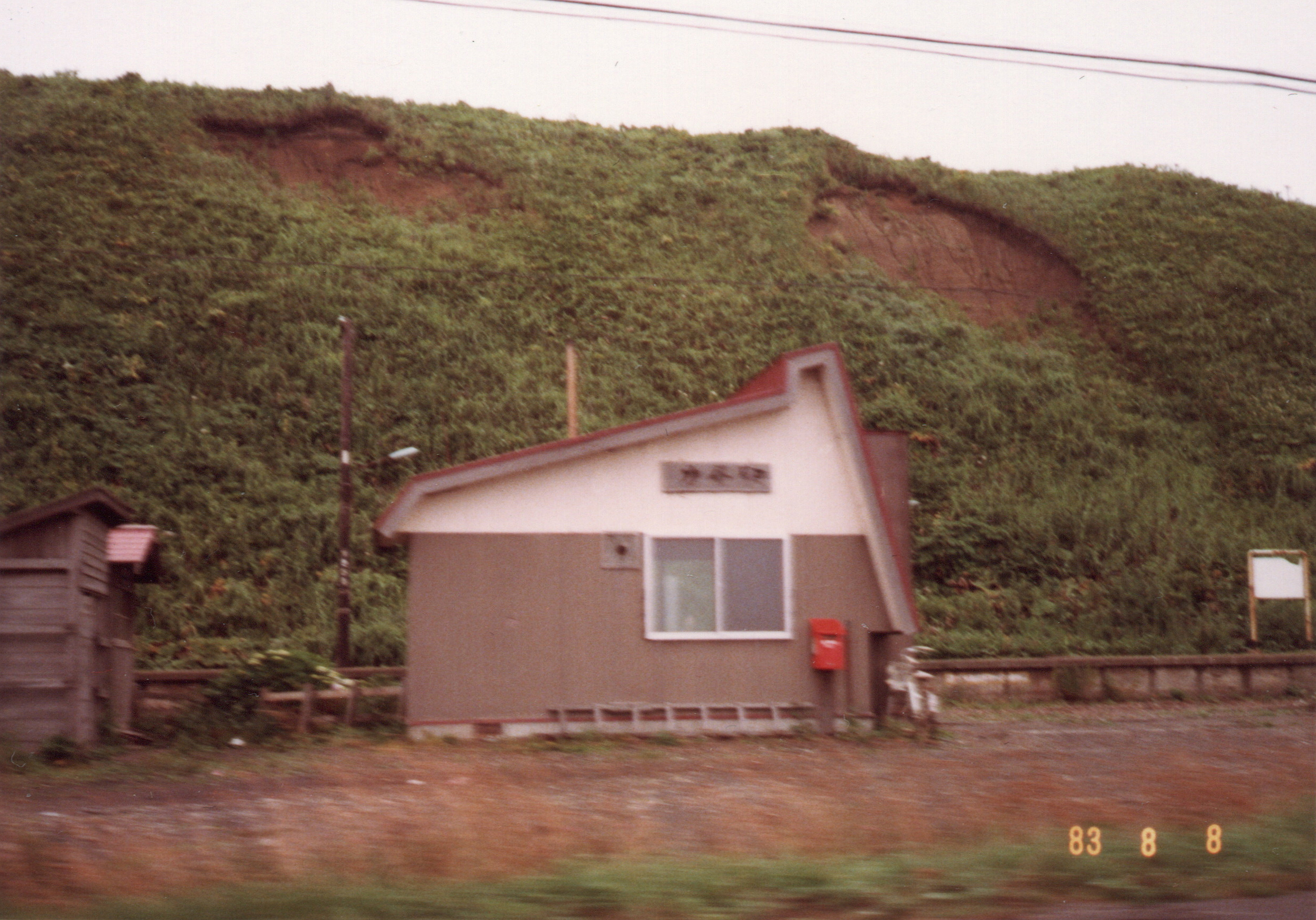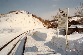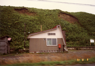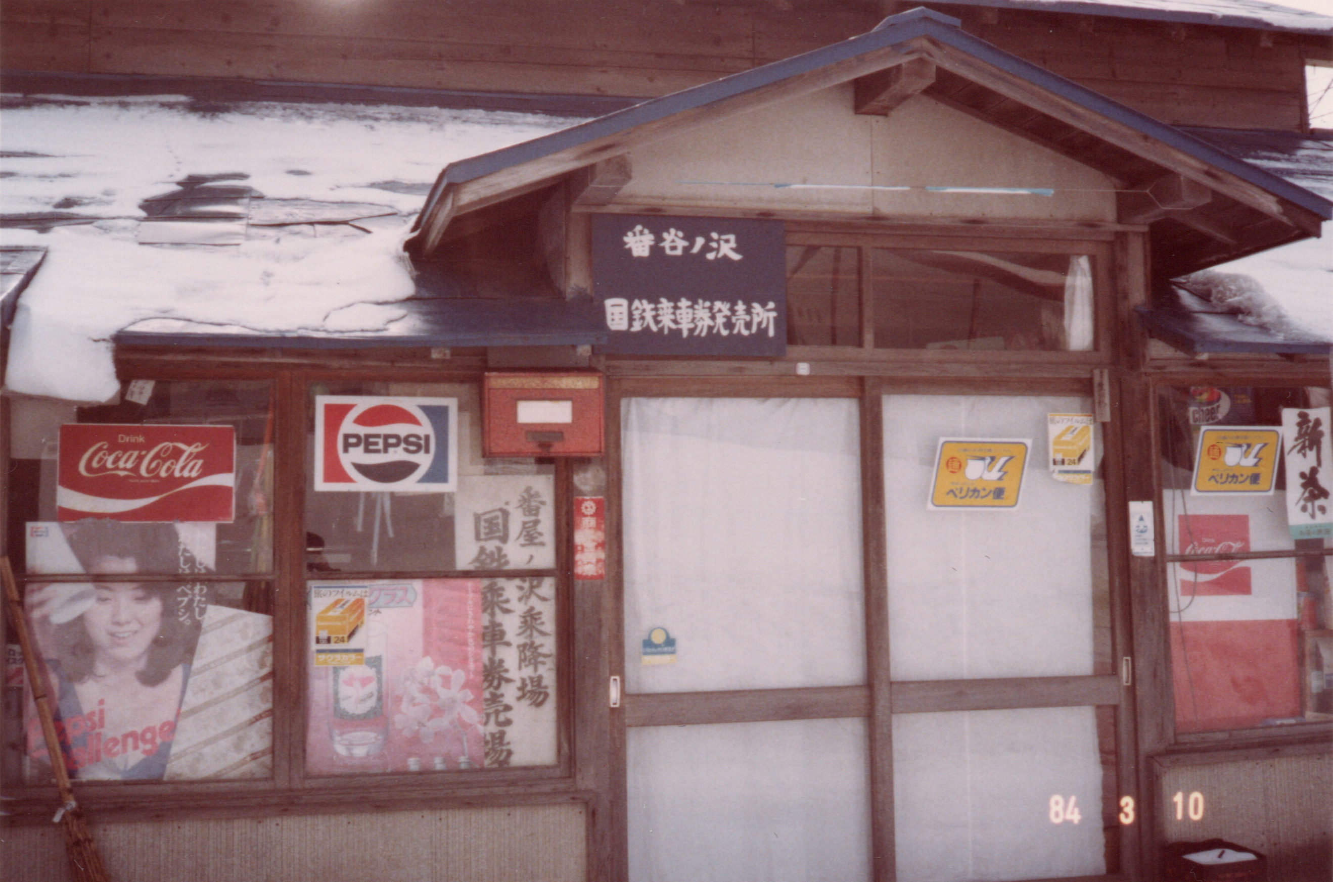 有名な宮脇俊三氏のエッセイ(「ローカル線をゆく・北海道」昭和59年初版)によると、SL時代は番屋ノ沢仮乗降場に「切符を売る民間委託の小屋があった」と記されている。"小屋"というのが切符発売専用に設置されたブースのようなものか、それともこの待合室自体を指したものだったのかは不明だが、探訪当時(昭和59年3月)には既にそれらしき出札口はなくなっていて、その代わりに仮乗降場からかなり離れた雑貨店(?左の写真)が「番谷ノ沢国鉄乗車券発売所」となっていた。"番屋"とはニシン漁が盛んな時代、ニシンの群を監視したり網を保管しておくための共同施設のことで、当然"谷"は"屋"の誤りだ。 (ついでに言うと、駅名標などの"の"も道内時刻表・北海道時刻表ではカタカナの"ノ"に統一されている。)残念なことに、このときは店が閉まっていたのか、とにかく寒くて早く帰りたかったのか覚えていないが、なぜか切符を購入しなかった。仮乗降場発売の切符などあまり聞いたことがないので、どんな様式だったのか大いに興味のあるところだが、それだけに悔やまれてならない。