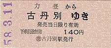 力昼から古丹別ゆきの普通片道乗車券(発行年不明・コピー)。その後の調査で、廃止頃まで左のような連綴式の委託乗車券が存在することが判明した。軟券の委託券は当時内地ではポピュラーだったが、北海道では比較的少なくて多くは硬券だった。力昼駅近辺の一般商店か委託を受けた普通の民家、もしくは上記の"番谷ノ沢国鉄乗車券発売所"で発売されたものと思われる。(仮乗降場は"キロ程"が存在しないので、行先から遠い側の最も近い"駅"が運賃計算上の乗車駅となる。)