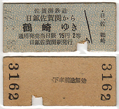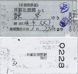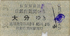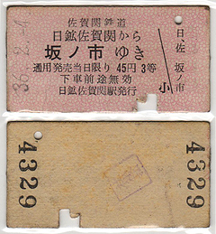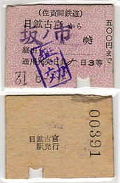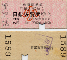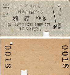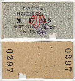 *2 その後の調査で、昭和31年10月発行の「日鉱佐賀関から日鉱大志生木ゆき」や昭和33年1月発行の「日鉱佐賀関から日鉱古宮ゆき」3等B型常備券(硬券)が実在することが判明した。また、某HPには昭和37年10月発行の「日鉱佐賀関から日鉱小志生木ゆき」2等B型常備券も掲載されており、これが本物ならば、少なくとも日鉱佐賀関駅にはすべての中間駅向けに常備券が設備されていた可能性が高い。