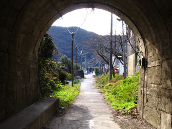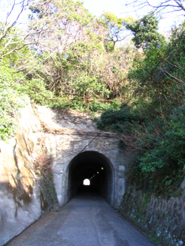 ※ その後、佐賀関出身のK氏(60代)よりご丁寧なメールを頂戴し、当時の"大志生木トンネル"内には上記のような「ステップ」はなかったとのことでした。「そもそも、このような"ステップ"があると軽便そのものが通行できないのでは?」というご指摘でしたが、確かに、車両の幅(2m強)と高さ(3m強)を考慮すると"差し引き"したトンネル幅(3m)ではあまりにも余裕がなく、筆者の推理には無理があるようです。また、現在のトンネル内のコンクリート壁も当時のものではなく、明らかに補強工事がなされているとのことでした。