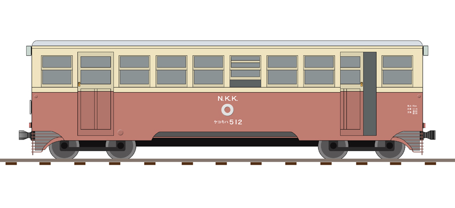 最初客車として転入された"カホ1"と"カホ2"を昭和26年になって気動車に改造した"ケコキハ510"と"ケコキハ511"、及び昭和26年新造の"ケコキハ512"(下)が在籍した。晩年に撮られた写真でよく見掛ける先頭車はこれら3輌のうちのどれかで、前面に"バスケット"(自転車などを置くための荷物台)が付いたもの(側面9枚窓)が"ケコキハ510/511"、前面下部に特徴的な"保護網(救助網)"が付いたもの(側面8枚窓)が"ケコキハ512"と考えてよい。元車掌氏によると、いずれも"両運転台"式で必要に応じて運転士が前後へ移動していたという。なお、廃線後"ケコキハ512"は解体されずに"佐賀関小学校"に寄贈されたらしいが、昭和43年頃に同校入学の方に尋ねたところ「(ディーゼルカーを見た)記憶がない」というので、これもかなり早い段階で廃棄されてしまった可能性が高い。