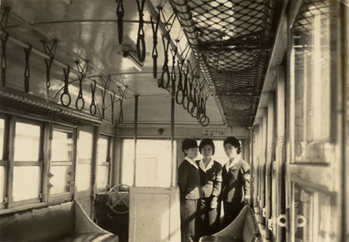 左: 気動車の内部を撮影した貴重な写真(笹葉弘子氏所蔵)。前面が2枚窓で、しかも左窓が上下仕切りのない1枚ガラスであることから、"ケコキハ510"または"ケコキハ511"のいずれかではないかと推定される。座席は対向式のロングシートタイプで、これまた路面電車の仕様とよく似ている。また、車内灯に"蛍光灯"(写真:天井部)を使用している点は、当時の軽便鉄道としては画期的であったという。