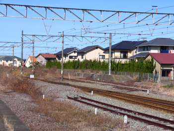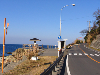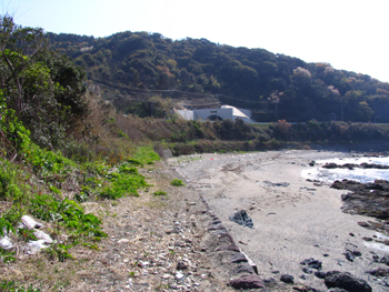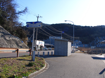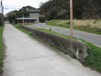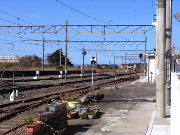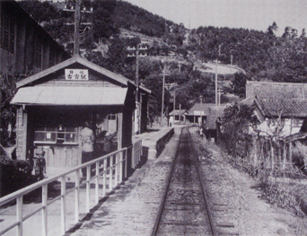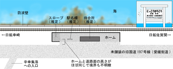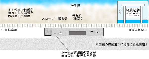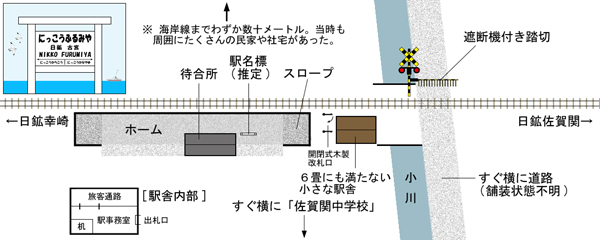 ※ その後の調査で、昭和40年代初期(廃線後間もなく)に撮影されたとみられる古宮付近の航空写真(出所不明)が存在することがわかり、知人にお願いして拝見させて頂いたところ、件の国土交通省公開のものよりかなり解像度が高く、日鉱古宮駅のホームと駅舎がばっちり写っていました。写真を掲載できないのが非常に残念ですが、駅の位置や構造はほぼ筆者の取材通りで、@中間駅としては比較的ホームが長いこと、A駅舎よりホーム上の待合所のほうが大きいこと、B想像以上に海岸線が迫っていること、C踏切の手前に道路と並行して小川があったこと などが確認できました。また、駅の幸崎寄りには佐賀関中学校の裏門があり、ホームの幸崎方にも"スロープ"が認められることから、旅客は必ずしも改札口(日鉱佐賀関方)を通る必要はなかったものと思われます。