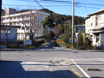 この後、間もなく線路は全長146mの"古宮トンネル"に入る。トンネルの出口はもう古宮の集落で、左手に砂浜(現在は"国道九四フェリーのりば")、右手に"佐賀関中学校"を見て、ほどなく日鉱古宮駅に到着する。当時は海岸線がかなり内陸方に迫っており、現在の国道197号線(新線)辺りからフェリーのりばにかけてはほぼ海の中だった。現在、国道の右側にかろうじて線路跡の細道は確認できるが、古宮トンネルの開口部は既に閉鎖されており、また駅の位置も今一つはっきりしなかったので、通行中の地元住民の方に聞き取り調査を行い、ようやく中学校真横の四つ角付近と判明した。現在の自転車置き場付近にホーム、さらに佐賀関寄りに駅舎があったのではないかと思われるが、細かい位置については明確ではなく、今後も調査を続けてゆく予定。