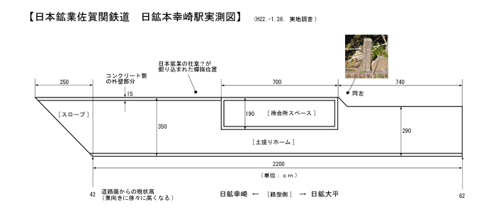 当駅は日鉱幸崎を出発して間もなく、線路が東向きの大きいカーブから直線に入る付近にあり、沿線で唯一はっきり当時のものとわかるホームがそのまま残っていることから、平成22年1月に筆者が実際に現地へ赴き、詳細に実測を行った(下図)。ホーム長は約25m(気動車2輌分)、ホーム幅は約3〜3.5mで、根拠はないが、恐らく他の停留所も全てこの規格で建設されたものと推測したい。ほぼ中央に待合所の痕跡(コンクリートの基礎)がある他、今回、線路反対側で小さな石柱を2ヶ所発見した。太字「○」の記号が深く掘り込まれており、すぐに日本鉱業の社章「蛇の目(ジャノメ)」ではないかと思ったが、後日文献を確認したところ案の定、日鉱社用地の"境界杭"であることが判明し、他に日鉱本幸崎〜日鉱大平間にも同様の石杭が残っていることもわかった。