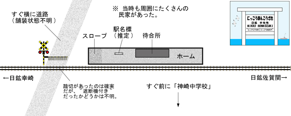 本駅は"神崎"(集落名表記で読みはやはり「こうざき」)地区内にある比較的新しい停留所だが、当初から眼前にある"神崎中学校"の通学最寄り駅としての性格が強かったという。(5.佐賀関鉄道の乗車券類 (2) 定期乗車券及び回数乗車券 の項を参照のこと) 本鉄道の駅では唯一、線路の(下り向き)左側にホームがあり、通学客はその都度"踏切"を渡らなければならない不便を考えると、建設当時は反対側に民家などが密集していた可能性が高い。なお、この周辺では現在、道路整備が急ピッチで進んでおり、"中洲"状に取り残された区域にあるこのホーム跡もいずれ撤去される恐れがあるため、興味のある方は早めの訪問をお奨めする。