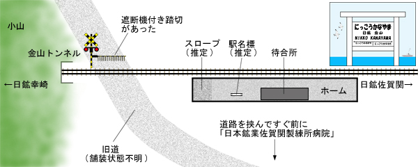 金山トンネルを抜けると、すぐ右手に当時は"佐賀関製錬所病院"があった。(その後、"佐賀関町立病院"となり、民営化を経て平成17年頃古宮方の海岸へ移転。) 関係者の話によると日鉱金山駅はトンネルを出てすぐの所にあったというので、下図のような配置を推定してみたが、詳細な位置については今後も調査を継続してゆく予定。