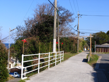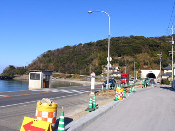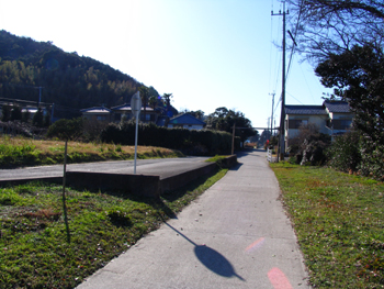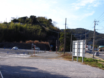 左: 現在の日鉱小志生木駅跡。平成22年1月現在、小志生木地区では佐賀関方に"志生木トンネル"(右端)の建設が進んでおり、筆者が同地を訪れた際も件の緑地帯が取り壊されようとしていた。近い将来、この辺りの外観がかなり変化してしまう可能性が高いので、写真に収めたい方は早めの訪問をお奨めする。