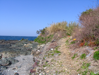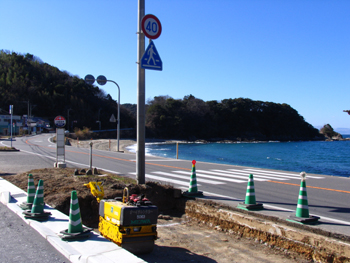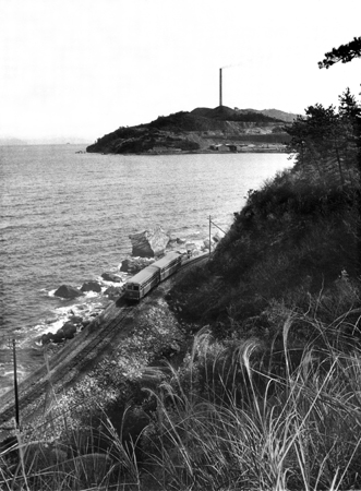 日鉱辛幸を出ると、やがて国道は山道に入るが、線路のほうは海岸線に張り付いたまま進むため、両者はかなりの高低差となる。左下の写真は昭和34年に撮影されたもので、右下はほぼ同じ位置から撮った現在の様子。画角が少し違うのが気になるが、中央に特徴的な大岩が写っていることから、今の大分バス・光明園前バス停から200m程佐賀関寄りの国道上(?)から撮られたものと推定できる。この区間は沿線でも最も高潮の影響を受けやすかったらしく、関係者の話によると台風でなくとも冬場の高波でしばしば車輌が水を被ったという。