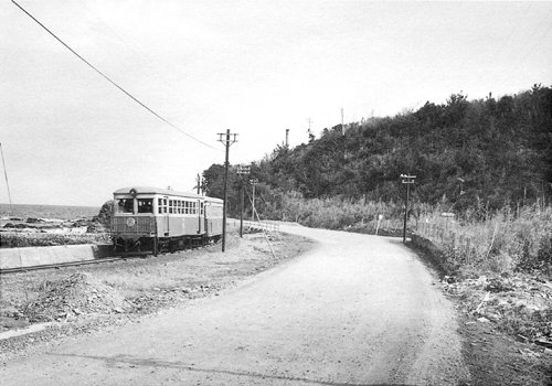 本鉄道は数ある軽便鉄道(軌間762mm)の中でもなぜか影が薄い。風情ある白砂青松の海岸線を横目に見ながら、全長わずか9.1kmの線路を30分近くも掛けてトコトコと走る姿は、鉄道ブームの昨今ならばさぞかし持て囃されたに違いないが、早くも昭和38(1963)年5月には廃止されて、既に47年が過ぎ去ろうとしている。鉄道ファンならば色々な書籍を見て本鉄道をご存知の方も多いと思うが、せめて「あともう10年は存続してほしかった」と悔しがるのは、決して筆者だけではないはずだ。本鉄道の実態を完全に検証できるだけの十分な資料や記憶を残せないまま、早々に姿を消してしまったことが本当に残念でならない.....。