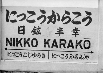 左: 当時の日鉱辛幸駅駅名標。日鉱辛幸駅の古写真は左上とこの2枚しかなく、しかも比較的低位置にあるはずの駅名標の隙間から"空"が写っていることが「線路の海側にホームがあった」と誤認する原因となった。しかし、その後本鉄道の駅名標は基本的に「表も裏も同様に表記する仕様である」ことがわかったので、この写真は道路側(裏側)から撮影されたものと考えれば矛盾はない。