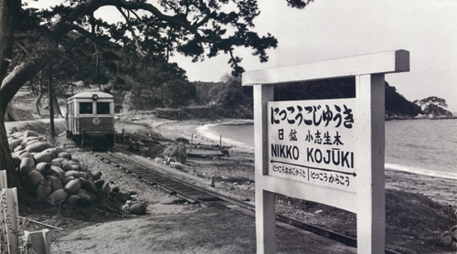 左: 同じく製錬所が作製・配布した"佐賀関鉄道廃止記念絵葉書"の1枚で、"日鉱佐賀関駅を発車する旅客輸送開始当時の列車"(昭和20年代初め)。"客貨混合列車"は極初期の頃のみで、昭和26年からは蒸気機関車に代わってディーゼルカー(気動車)が旅客輸送の主役となった。