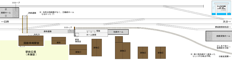当駅を出発した列車は間もなく国鉄貨物ホームの直前で右にカーブしていくが、すぐにS字状に進路を修正し、直進方向に"硫酸線"を分岐した後、再び大きく東向きに右折する経路をとる。軌間が異なるため、当然のことながら社線レールと国鉄線レールの接続点は存在しない。国鉄貨物ホームの大分寄りに製錬所副製品の濃硫酸積み替え施設があり、本鉄道廃止後もトラック輸送による専用列車への積み替え作業は継続されていたようだが、それも平成8年頃には廃止され、現在JR幸崎駅の貨物取扱はほとんどなく、駅舎も平成21年に簡素なものに造り換えられて、常駐する駅員(業務委託)も1人だけになった模様である。また、元車掌氏の話によると本鉄道の気動車はすべて"両運転台"で、単独運行ならば問題はないが、「気動車+客車(無動力)」の組み合わせが基本編成となる場合は、終着駅において列車の入れ換え(転向)が必要となる。文献によれば、やはり"転向線"(スイッチバック式の"引き上げ線"か?)がどこかにあった模様だが、本線との分岐点や構造など詳しいことはよくわからない。なお、平成11年頃まで当駅の跡地には「佐賀関製錬所 幸崎駅専用線」の看板が掲げられていたらしいが、現在は上記の設備や建物の大半が取り壊されて、新興の住宅地に変貌しつつある。
