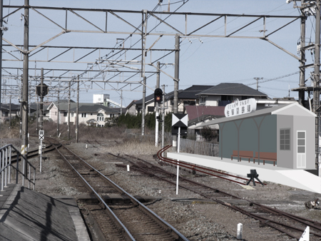 右は、各種資料を基にして、現況の写真位置に当時の日鉱幸崎駅ホームを合成再現したもの。検討の結果、画像の手前に写っている跨線通路は当時のものではなく、左の国鉄1・2番線ホームもかなり大分方に延長されている可能性が高い。