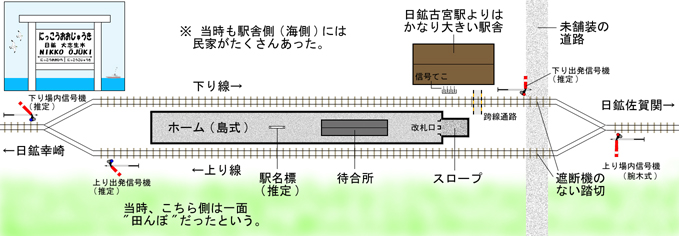 「鉄道ピクトリアル」昭和39年7月臨時増刊号に掲載された堀江光雄氏撮影の"日鉱大志生木駅に進入する上り列車"の写真を見ると、右手前に小さな車道と遮断機のない踏切が写っており、これが現在の"大志生木幼稚園"のすぐ横(東側)を通っている道路に相当すると考えられるので、駅舎はやはり幼稚園の建物付近にあったとみてよさそうである。また、同写真の佐賀関方(左上)には鉄道用の"腕木式信号機"(腕の長さから上りの「場内信号機」と考えられる)も写っていることから、他に3つの信号機(「場内」1・「出発」2)もあった可能性が高い(上図)。但し、ホームの長さと幅に関しては、図の雰囲気よりもかなり規模が大きかったことは間違いないが、具体的な数値まではよくわからなかった。本駅は、やや幸崎寄りにあった"日鉱大志生木社宅"(最盛期は400世帯・住民約1700人)の最寄り駅であり、早朝から深夜まで通勤通学客でかなり乗降量が多かったにもかかわらず、ホームや駅舎を撮った写真を全く見掛けないのは残念でならない。
