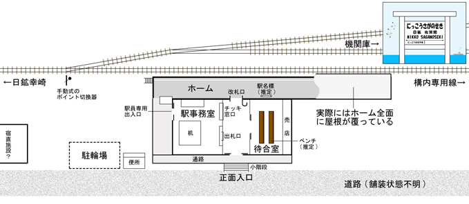 日鉱金山を出ると再び線路は海岸に近づき、左手に漁港、右手に佐賀関の街並みを見ながら、わずか700mほどで終点の日鉱佐賀関駅に到着する。ちなみに、この駅舎位置は航空写真や後のバスセンターの立地からほぼ確定しているが、古い文献や地図などを見ると、なぜかそれよりかなり製錬所構内寄りに記載されていることが多く、"キロ程9.1km"という数字は「廃線時の駅舎やホーム位置を基準にしていない」可能性が高い。本駅については、始点の日鉱幸崎駅と同様に比較的たくさんの写真が残されており、駅舎やホームの位置だけでなく車庫や引込線、構内に続く貨物線の配置なども概ね判明している。ただ、惜しむらくは肝心の駅舎やホームを接写した写真がなく、特に駅舎内部の様子が全くわからなかったが、今回、関係者の証言により大まかな構造も確認できた(下図)。