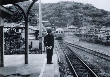 ※ その後の調査で、廃線直前に下りの踏切付近から日鉱大志生木駅のホームと駅舎の一部を撮った写真が存在することがわかりました。(左: 佐賀関製錬所第一大煙突 記念誌「関の大煙突」掲載) 駅の構造はほぼ筆者の取材通りでしたが、意外にも改札口(木製のラッチ)がホーム上にあり、「お願い 乗車券をおもちでない方は列車に乗る前に駅の窓口でお求めください 駅長」と書かれた看板も写っています。ホーム(土盛り)は軽便仕様のためやや低めですが、予想よりも幅は広く(推定6m以上)、待合所も扉付きのかなり立派なものだったようです。しかし、残年ながらこの写真ではホーム長や駅名標の位置、駅舎内の様子までは確認できませんでした。