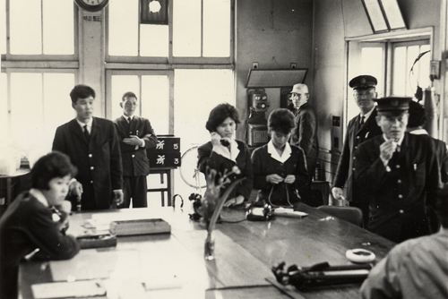廃線後、この駅舎はバスターミナル("国鉄バス佐賀関駅"・民営化後は"JRバス佐賀関駅")となり、筆者の記憶では確か出札口が"製錬所構内寄り"にあったと思うが、日鉱佐賀関駅当時はチッキ窓口と共に逆向き("幸崎寄り")だったことが明らかになった。駅事務室は相当に広いスペースで、運輸課本体の事務所は製錬所構内の別棟にあったようだが、通常の駅務の他、車掌による車内乗車券の売上計算など雑多な業務がここで行われたという。また、事務室の外れに"宿直施設"もあったというが、詳しい位置については目下調査中。下は昭和37〜38年頃の事務室の様子を撮影した貴重な写真(笹葉弘子氏所蔵)。