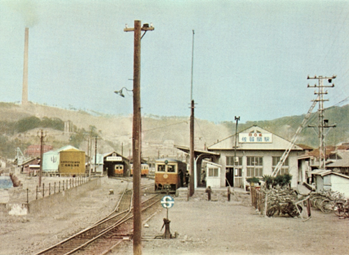 左下は廃線後に佐賀関製錬所が作製・配布した"佐賀関鉄道廃止記念絵葉書"の1枚で、手前に写っている車庫へのポイント"切換てこ"は事務室内からも操作することができたらしく、車輌の連結や切り離し作業も女性の車掌が行っていたという。なお、この晩年の駅舎は昭和30年代に入ってから建て直されたもので、以前は木造の駅舎であったことが古写真から判明している。また、平成13年には"JRバス佐賀関駅"が廃止となり、その後ターミナルの建物も撤去されて、現在は製錬所総務課管理の"社員専用駐車場"に生まれ変わっている。(右下:奥の中央右寄りに写っている白い建物が"こうばいかい"上浦店で、かつての"機関庫"付近と推定されている。)