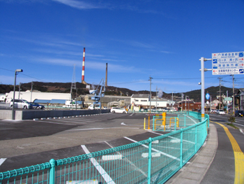 右下: 製錬所病院の跡地から海岸方(日鉱金山駅)を望む。中央に旧"佐賀関警察署"(県警の合理化で平成17年"大分東警察署佐賀関幹部交番"に降格)、遠くに佐賀関製錬所名物の大煙突が見える。