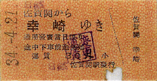 ※ その後、筆者は昭和37年4月(廃止の約1年前)発行の「日鉱佐賀関から幸崎ゆき」(右:大人小児用)を入手しましたが、着駅部分は単に「幸崎ゆき」となっており、やはり「日鉱幸崎ゆき」ではありませんでした。一般に、国鉄接続駅における社線側の駅名については、接続の形態("乗り入れ"かどうか)や駅舎(出改札口)・ホームの位置("共同使用"かどうか)などにより、@国鉄駅と全く同名、A"新"や"社"など1文字を冠して区別、B社名または"電鉄"などを冠して区別 などのパターンを見受けますが、特別明確なルールはなく、筆者が調べた範囲では、"日本鉱業"側が発行したこれらの資料を見る限り、当駅の場合は正式な駅名も「@国鉄駅と全く同名」だった可能性が高いように思われます。にもかかわらず、多くの鉄道誌上で当駅が「日鉱幸崎」と記載されているのは、当時の資料が極端に少ないことに加えて、恐らく「本鉄道では全ての駅名に"日鉱"が冠せられている」という先入観に因るものではないかと想像されます。また、この乗車券の"9191"という券番もかなり大きめの数字で、上記の予想に反し、自社線内の硬券もそこそこ売れていたと考えるほかありません。それにしては、即売会やオークション等で本鉄道の出品物をほとんど見掛けないのが不思議です。