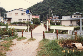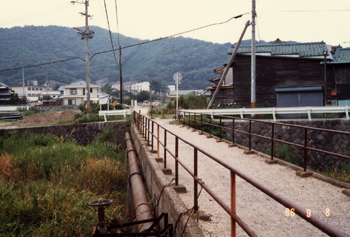 左上: かつては軽便鉄道時代の路盤や欄干がそのまま残っていた"大志生木橋"(昭和61年撮影)。最近になってコンクリート製の丈夫な橋に架け換えられた模様。橋の左横に見える水道管は廃線跡全線に渡って敷設されているという。中央遠方に日鉱大志生木社宅のアパート群、左に小さく"大志生木小学校"の建物も見える。