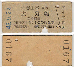 ※ 余談ですが、"急行かいもん"様には、同時に右のような大変不思議な所蔵品の画像も頂戴しました。発行日付(43.-9.22.)と"JNRこくてつ"地紋から国鉄バス(佐賀関線)の乗車券であることはわかりますが、"佐賀関駅発行"であるにもかかわらず、乗車駅(バス停)がなぜか「大志生木から」となっています。これはどう解釈すべきでしょうか。筆者の取材では、日鉱大志生木駅の駅舎は廃線後間もなく取り壊されたようですので、廃線後5年も経た昭和43年時点で旧駅舎やその周辺に"出札所"があったとは考えにくいのですが...。また、印刷通り佐賀関駅で発行されたものとしても、なぜこのような区間(大志生木〜大分)の券を常備しておく必要があるのか、どうして改札鋏が入っているのか、ダッチングが"ゴム印"なのはなぜか、など疑問が残ります。("大志生木海岸"は有名な海水浴場ですので、ひょっとしたら"多客期の臨時券"かとも思いましたが、どうも発行日付(9月下旬)が合いません...。)