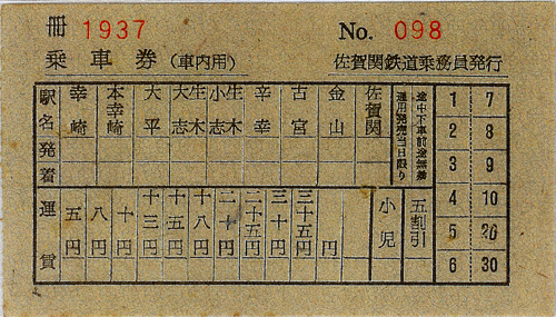 下は当時の貴重な"硬券"の乗車券。(【九州の私鉄入場券に関する考察】から再掲。) これらの切符は現在非常に数が少ないため、オークションなどでは極めて高額で取り引きされている。