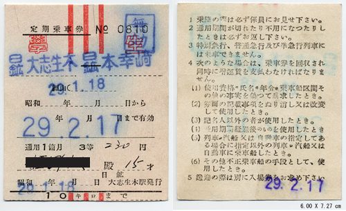 さらに、回数券も今回実券を確認したので、併せて紹介しておく(右下)。この券は日鉱佐賀関駅発行の比較的初期(昭和29年)のもので、かなり小型のうえになぜか等級表示がなく、物資が欠乏した時代の"鉄道省"様式に近い。確認はしていないが"10券片を1割引き"(225円)で発売したものと推定される。定期券・回数券共に、晩年は様式が変更になった可能性が高いが、今のところ詳細はわかっていない。