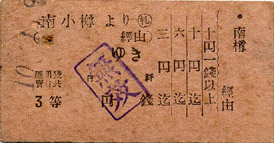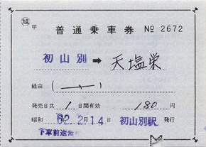 (上図例) 仮に、深名線蕗ノ台駅を発駅と考えた場合、昭和39年当時、羽幌線力昼駅までは2等で運賃500円以内だが、1つ先の古丹別では500円を超えてしまうため、甲片が使えるように切断位置を右にずらせば、乙片に不備が生じる。逆に、乙片に矛盾が出ないよう「500円まで」の位置で切断すれば、甲片に不備が生じるため、どちらにしても不正は難しくなる。だからといって、乙片の着駅を古丹別と同じ「1000円まで」の駅に書き換えれば矛盾はなくなるが、駅に納める運賃も増えてしまうので、結果として"不正な利益の幅"はそれ程変わらない*1)ことになる。確かに、この方法でも不正を完全に封じることはできないが、実際には近駅の多くが既に常備式・準常備式で設備されているはずなので、乙片に記入する運賃の安い「補片」対象駅(ダミー)を探すのも容易ではなさそうだ。しかし、「運賃を少しだけごまかして記入したり、断線間の曖昧な部分で斜めに切断する」といった"合わせ技"も考えられるので、なかなか一筋縄ではいかないのも事実。