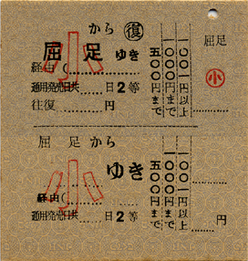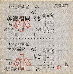 なお、最後になるが「補片」と同様に「補充往復乗車券(略称は『補往(ほおう)』)」という券式もあり、これも昔は硬券(C型)だったが、国鉄ではやはり昭和41年頃に廃止され軟券化されている。ほとんど売れない券種だったためか、私鉄の廃札券(C型硬券:下図)をオークションなどでよく見掛けるが、大きくかさばる割りに補充スペースが小さくて見にくいために、現場では「補片」以上に敬遠されたものと思われる。発行済みの実券については、その性格上、フルサイズ(C型)はもとより往片(下)と復片(上)がそろったものさえ、今ではほとんど残っていないようだ。