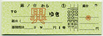 やはり、新1等券は「異級」券のほうが需要が多かったはずなので、下のような券を推定してみた。1等券は英語併記が「旅規」で規定されているため、旧1・2等券と同様に「TO」「¥」の加刷の他、運賃も高額となるので、1000円まで、2000円まで、2001円以上の3区分となっていたようだ。また、この頃は各印刷場共に「異」の朱影文字が刷り込まれているものが多く、札幌印刷では昭和30年代の末期に「異」字体の変更も行われた模様。但し、異級表記は通常の1等補片に「□に異」のゴム印を捺して使用することも認められていたので、口座数を少なくするために専用券を置かなかった駅も多いと思われる。("蕗ノ台"のような小駅では、異級券どころか硬券の「1等補片」自体がなかった可能性が高いが...。) さらに、国鉄では昭和32年から「支社制」(全国9区分)を採用したため、昭和30年代の後半から○に「青」「札」「旭」「釧」など、発行駅を管轄する鉄道管理局記号の代わりに一律「@」(北海道支社)などの支社番号が印刷されるようになったという。