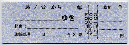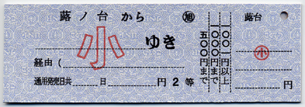その後、昭和41年3月から右のような現行の大型軟券(7.3 X 10.2 cm)の「補片」が採用されるようになった。やはり、2等は淡青色地紋、1等は淡黄緑色地紋だったが、昭和45年に等級制が廃止されてからは淡青色に統一され、昭和52年前後に近距離硬券乗車券の地紋色が淡青色から淡赤色に変更された後も、大きな改定はなく現在に至っている。昭和41年頃はまだまだ硬券の全盛期であり、「補片」などの補充乗車券類だけが、なぜこんなにも早く軟券化されたのかよくわからないが、やはり上記2.@Aのような問題から、少しでも発券ミスや不正を減少させようとする意図の表れではなかったかと思われる。