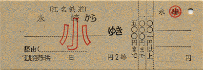 私鉄の場合も、概ね同時期の国鉄券様式を踏襲する傾向にあり、各社共にほぼ同様の硬券の「補片」が確認されているが、よく見るD型"廃札券"の多くはなぜか「小児専用券」ばかりで、小児の需要があまりなかったことをうかがわせる(右図)。しかし、一部の中小私鉄ではかなり近年まで硬券の「補片」が残っていたのも事実で、島原鉄道や大井川鉄道などでは昭和56〜57年頃まで例が見られる他、長野鉄道(B型:下図)など極一部ではひょっとしたら現在でも現役の可能性もありそうだ。(ご存知の方は是非お知らせ下さい。)