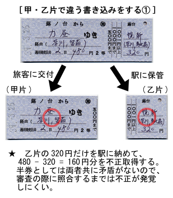 硬券の「補片」では、必要事項を記入して券を旅客に渡してしまうと、駅の側には「どのような券を売ったか」という記録が残らないために整理作業(売上集計)すら行えない。そこで、発行に際して券を左右に切断し、左側の甲片のみを旅客に渡して、右側の乙片を駅側で保管するという方法が採られていた。しかし、出札員が故意に甲片に遠駅、乙片に近駅を記入して近駅分の運賃を駅に納めれば、すぐには不正が発覚しない。乗車券類は使用済み回収後に「審査」が行われるので、後日、甲・乙片を照合して不正が判明する場合もあるが、うまく甲片を回収されないように工夫すれば、あまりに常習的でない限り露見しにくいように思われる。また、もっと単純に、ペンで記入された必要事項を旅客が"インク消し"で消去・上書きしたり、筆画の少ない部分に加筆して改竄することも考えられる。