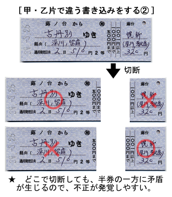 切断して発行された不正な「補片」の甲片は、出札員自身が悪用する場合もあり得るし、他の者に渡って"不正乗車"や別の駅で"払い戻し"を受けるなどの利得行為に利用される可能性がある。しかし、不正乗車に使用するにしても、甲片は出札後数日内に乗車時改札・車内改札(特改)・集札等に際して他の職員の目に触れることになるし、乙片はその日のうちに駅の整理作業(売上集計)に掛けられるので、一見して半券の状態(特に運賃と切断位置の関係)に不備があれば、すぐに不正が露見してしまい役には立たない。断線が1ヶ所しかなく、単に甲・乙片を分けるためだけの存在ならば、甲片の着駅欄に最遠端の駅名(例えば九州の枕崎駅)を記入してもすぐには不正が発覚しない理屈だが、複数の金額帯断線を設けるだけで、下図のように不正な書き込みがしにくくなるため、鉄道会社の損害がその金額帯の範囲で済むという利点がある。
