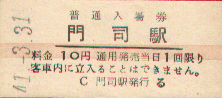 普通入場券は、改札口内に入る送迎者などを発売対象とした”きっぷ”の1種ですが、厳密には”乗車券類”の範疇に属さず、鉄道営業上はそれほど重要性のない雑収入に対する料金券に過ぎません。通常、最低片道運賃と同額ですが、この券で旅客車両に乗車することは本来認められていない(乗車券ではないので、もし乗車した場合は、入場券との差額ではなく運賃全額が請求される)ため、原則として同一駅内で発売・即回収という寿命の短い特殊なきっぷと言えます。乗車券を所有していない者をプラットホームに入場させることは不正乗車の原因ともなるため、大正期以降は、送迎者など滅多にいないと思われる僻地の小駅にも例外なく設備されるようになり、またデザイン的にも、乗車券類との判別を容易にするためか、白地に駅名部分が大きく印刷され、さらに昔は中央に横一条の朱線を帯して独特の風格があったことから、いつの間にか収集愛好家が増えてきました。赤字ローカル線の一斉廃止を機に、昭和59年頃からはマニアが急増し、近年は全国に数千人から1万人(最盛期)に及ぶ硬入ファンがいると言われています。なお、”普通”入場券に対して、首都圏などでいわゆる”通り抜け”(近道のために改札口内を頻繁に通過する場合)などを対象とした”定期”入場券という券種もありますが、こちらはむしろ”定期乗車券”などに近い様式(軟券)のため、コレクターズアイテムとしてはあまり人気がありません。